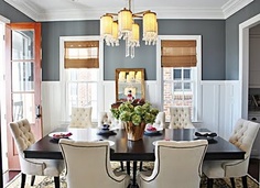 The mood I felt from the photos was casual elegance. Some of the elegant elements I love are the wainscoting in both photos and the fabric chairs in the second, while the casual elements include the light window treatments instead of heavy drapery and the use of a wooden farmhouse table rather than glass. I also love that neither blogger chose to go with a traditional crystal chandelier.