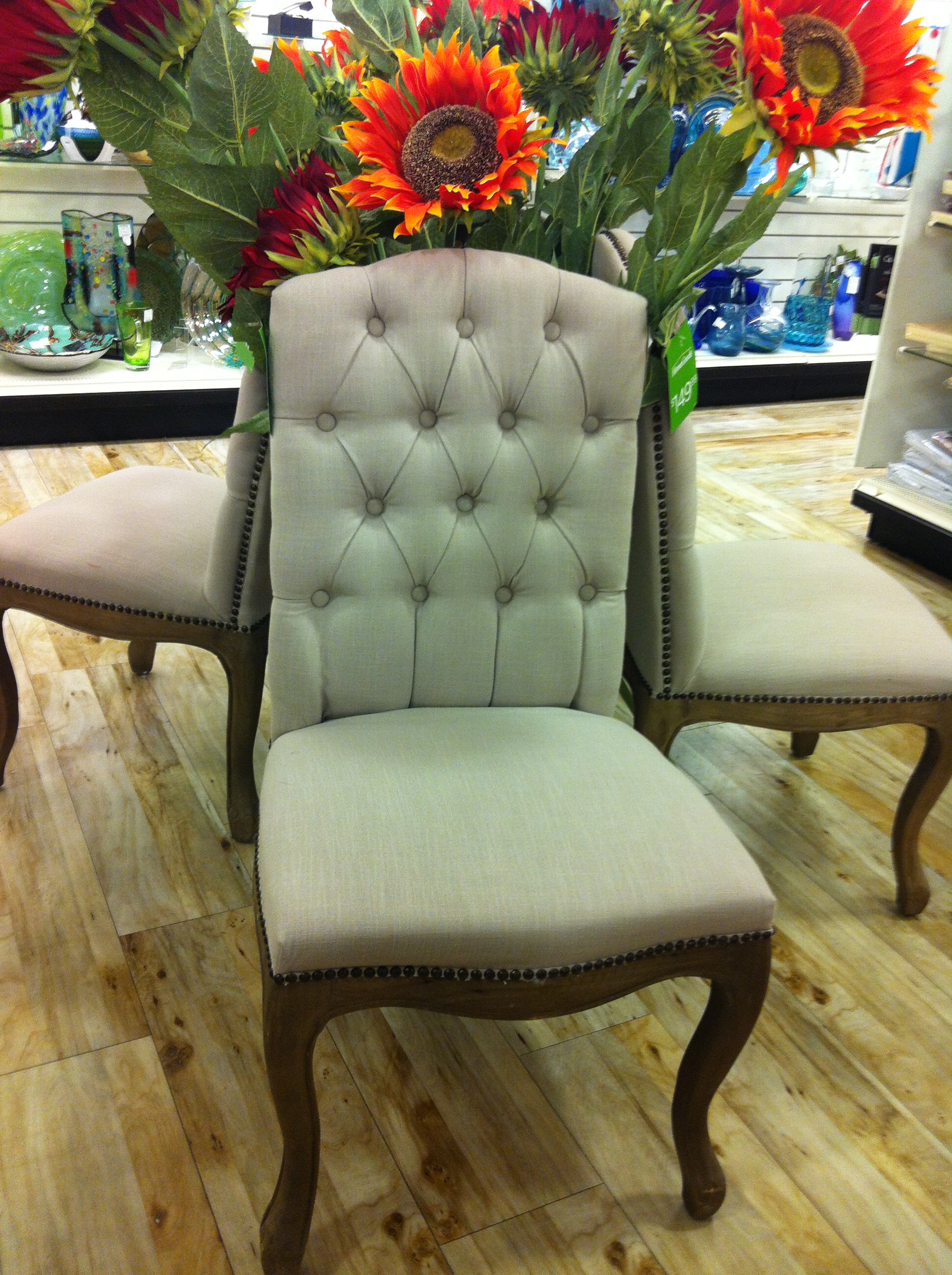 Well, the bargain gods must have been looking down on me because 2 days later, I found these treasures at…Β HOMEGOODS!!! I cannot begin to express how PERFECT these chairs were. I wanted 3 things in my dining chairs: upholstered and tufted , high backed, and studded in nail heads. Well these chairs absolutely NAILED IT π I was on a roll!