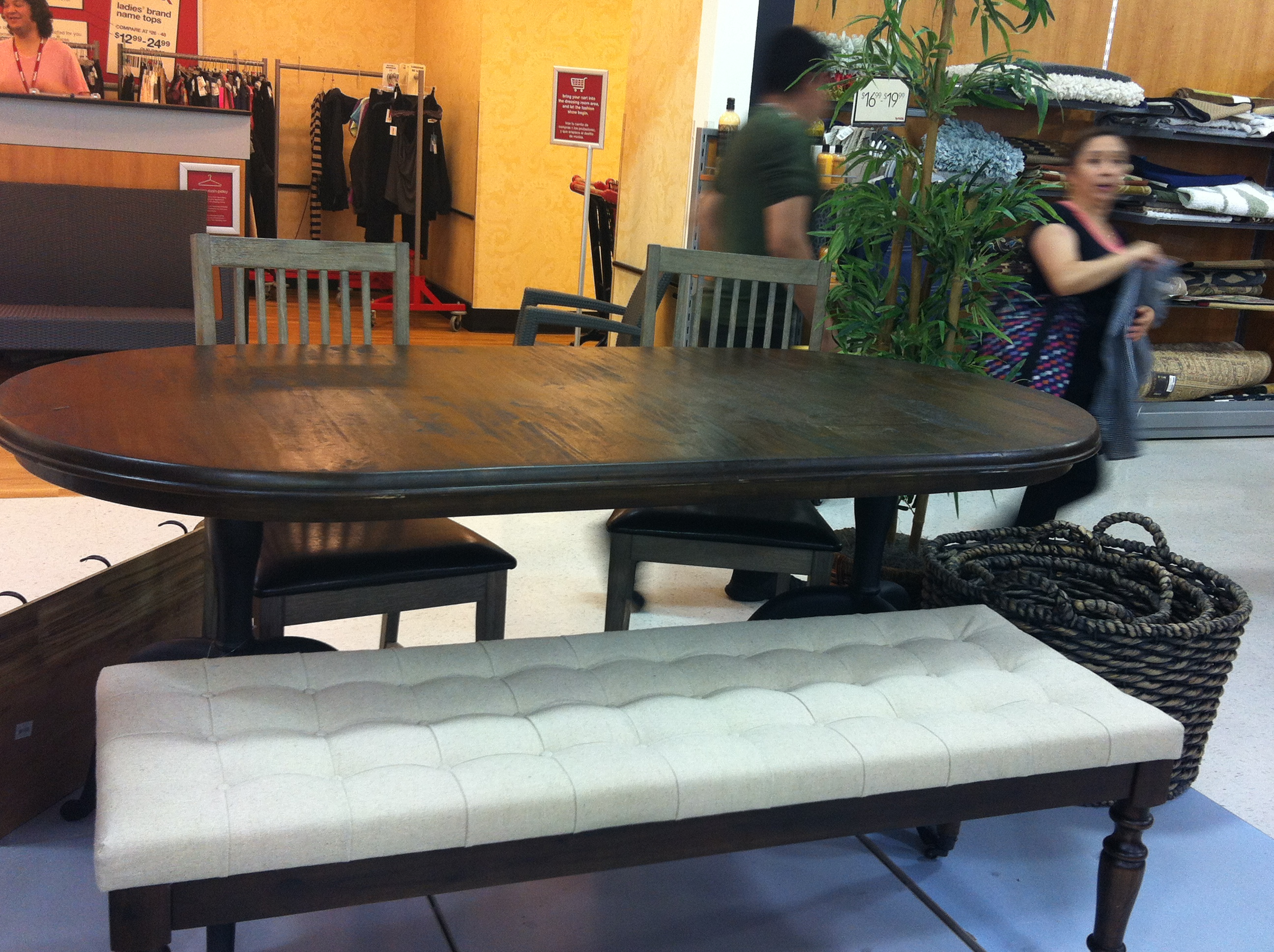 Then, I found the perfect table for an even more perfect price. And you’ll never guess where I saw it…TJ MAXX!?!?! WHAT?? And the price? $400!!! A STEAL. I also found a tufted upholstered bench on CLEARANCE the next aisle over!!