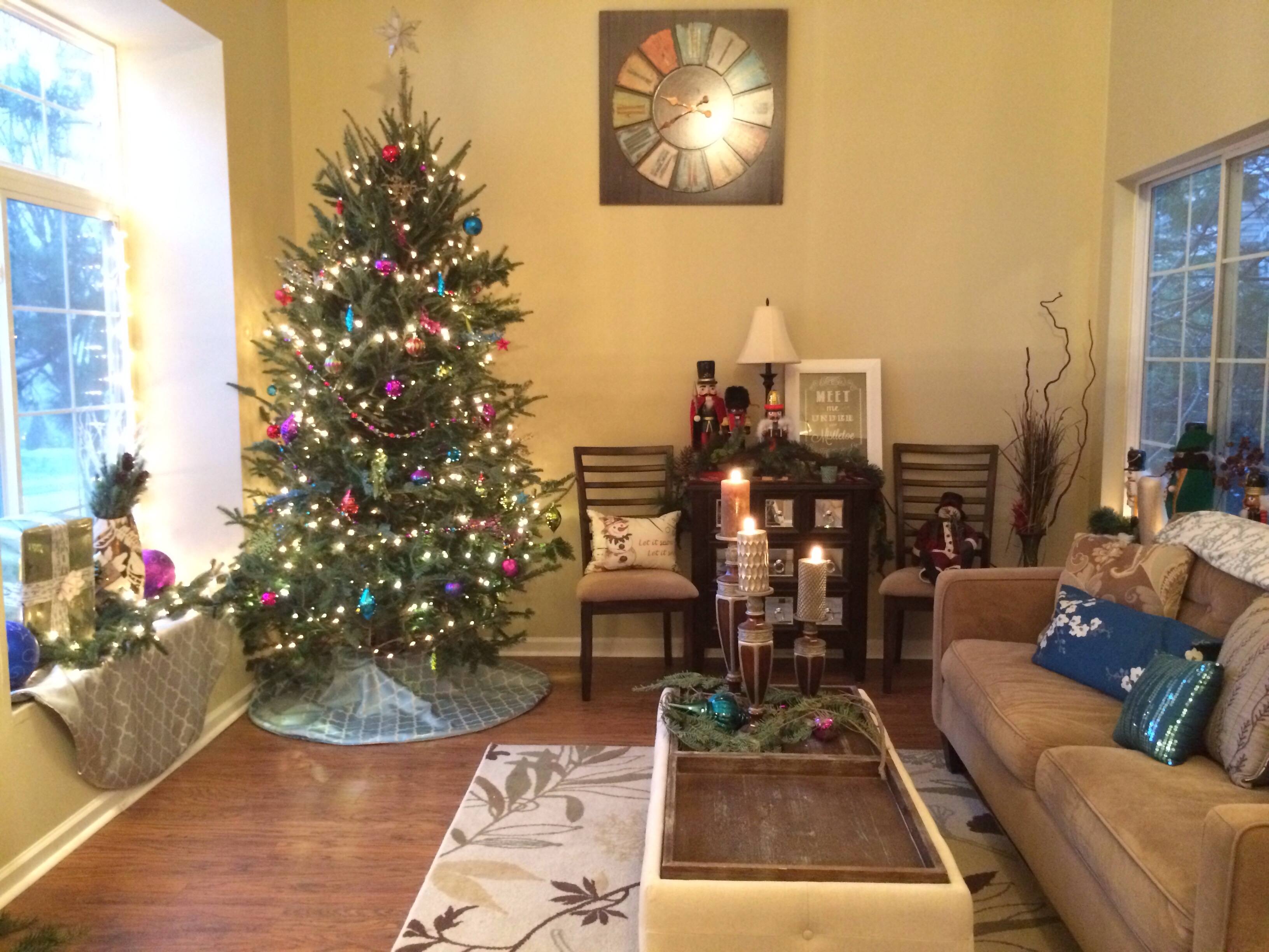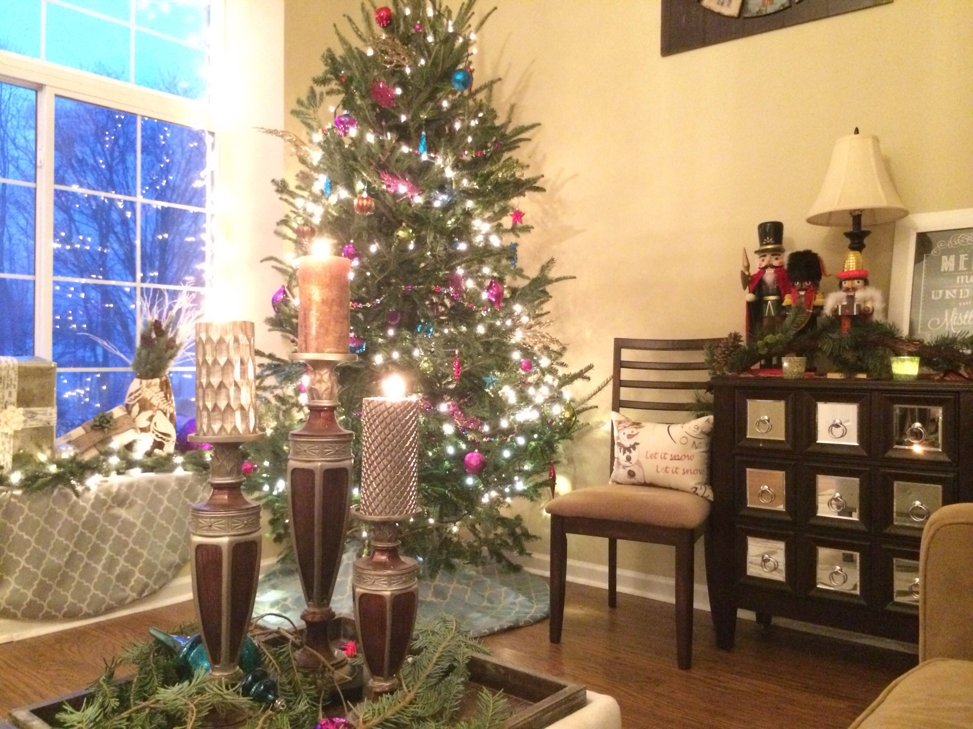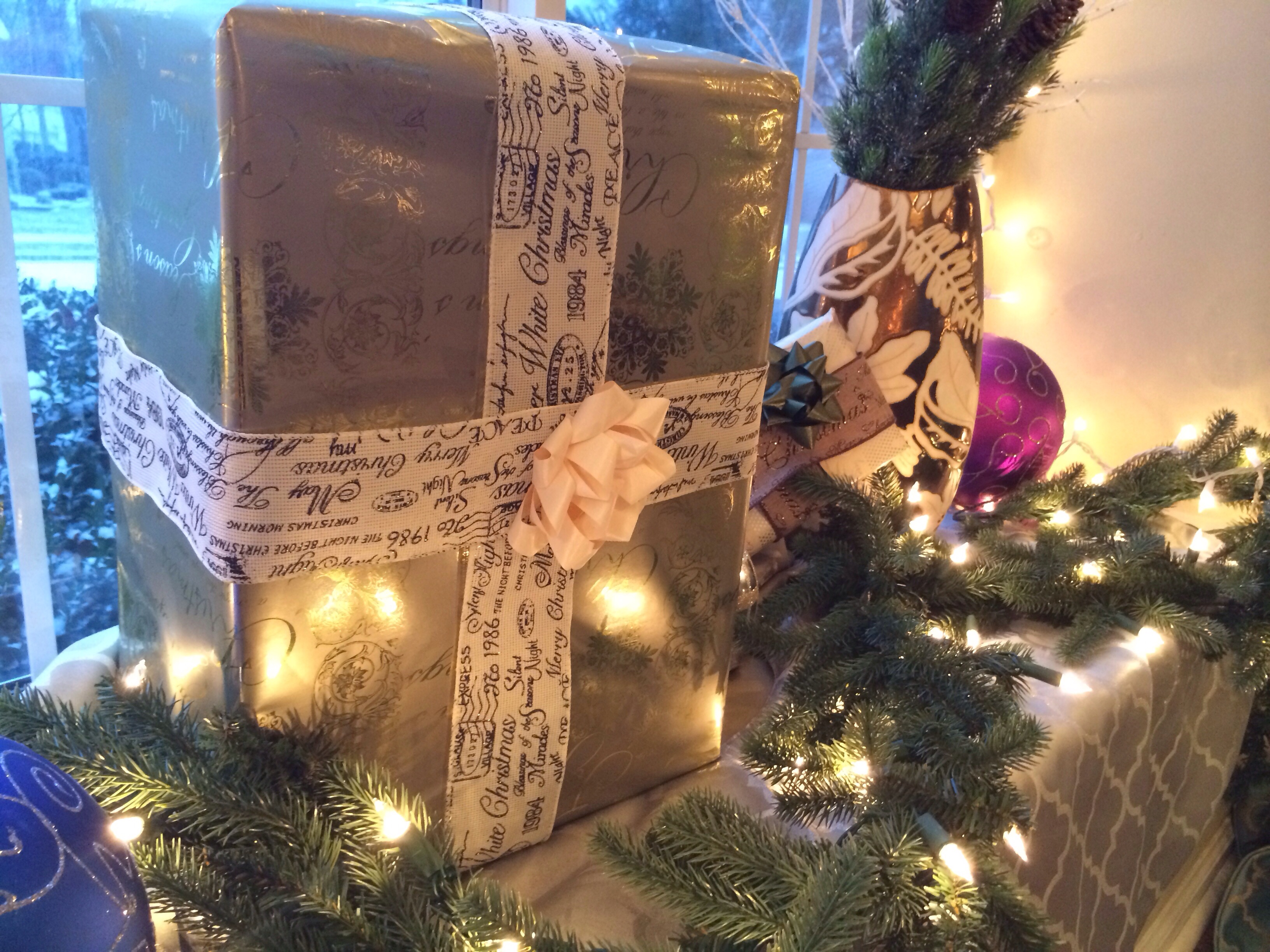 Beautifully wrapped presents adorn our windowsill coupled with large colorful ornaments and lit garland.