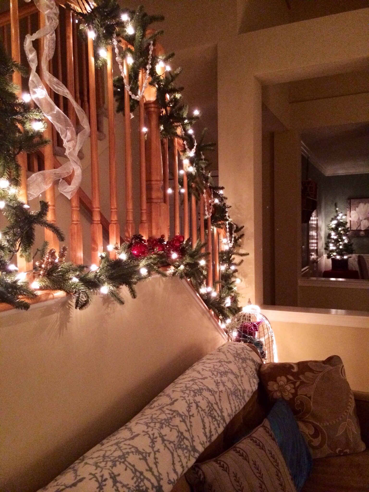 Finally, our cozy couch sits below our banister which has been dressed in garland, ribbons, and pearls.