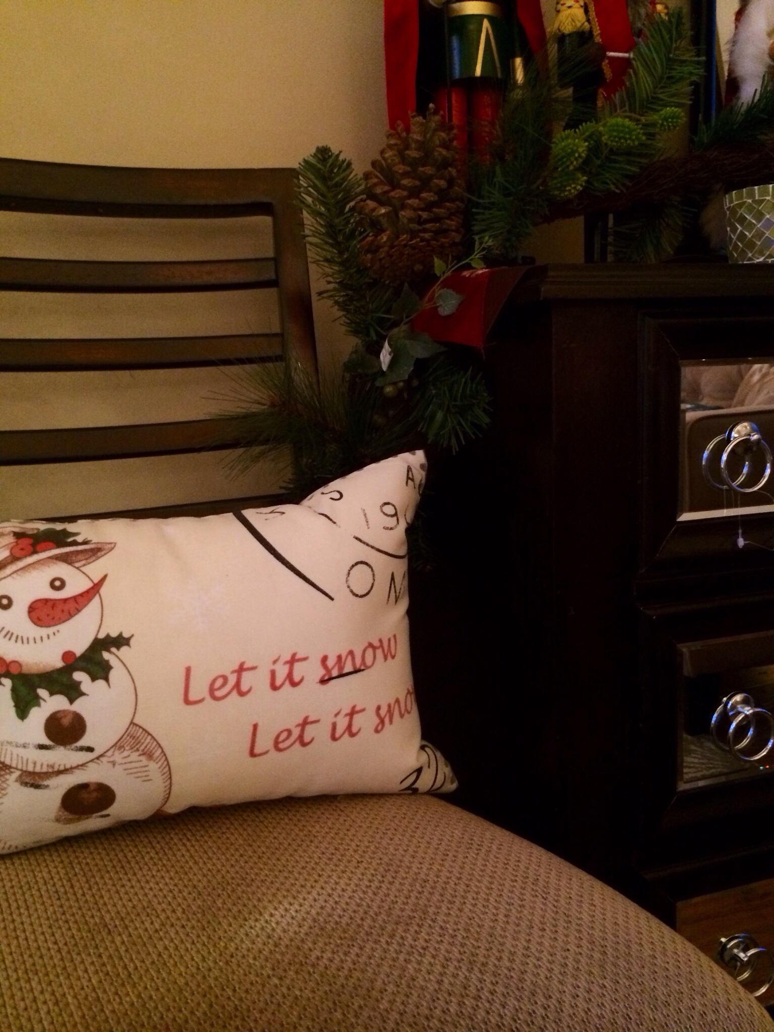 How cute is this “Let it Snow” pillow? I just love it. And what’s funny is that the moment I placed this pillow in the chair, I noticed snowflakes start to fall outside. By the time we were done decorating the room, our lawn was covered in white!